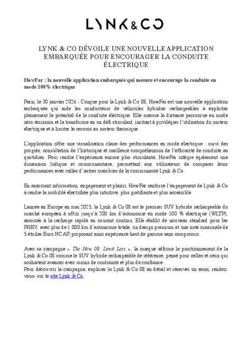 Conçue pour la Lynk & Co 08, HowFarest une nouvelle application embarquée qui aide les conducteurs de véhicules hybrides rechargeables à exploiter pleinement le potentiel de la conduite électrique. Elle mesure la distance parcourue en mode zéro émission et la transforme en un défi stimulant, incitant à privilégier l’utilisation du moteur électrique et à limiter le recours au moteur thermique.