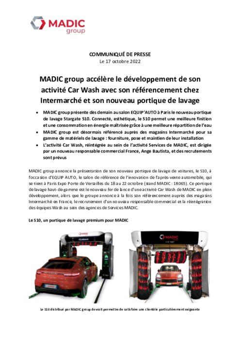 MADIC group présente dès demain au salon EQUIP’AUTO à Paris le nouveau portique de lavage Stargate S10. Connecté, esthétique, le S10 permet une meilleure finition et une consommation en énergie maîtrisée grâce à une meilleure répartition de l’eau. MADIC group est désormais référencé auprès des magasins Intermarché pour sa gamme de matériels de lavage : fourniture, pose et maintien de leur installation.