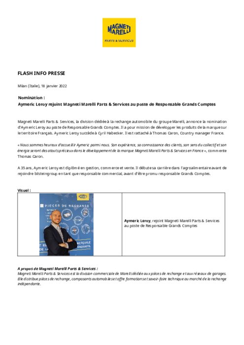 Magneti Marelli : Aymeric Leroy nommé Responsable Grands Comptes
