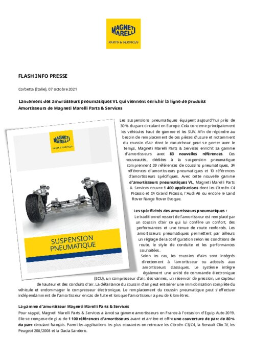 Les suspensions pneumatiques équipent aujourd'hui près de 30 % du parc circulant en Europe. Cela concerne principalement les véhicules haut de gamme et les SUV. Afin de répondre au besoin de remplacement de ces pièces d'usure et notamment du coussin d'air dont le caoutchouc peut se percer avec le temps, Magneti Marelli Parts & Services enrichit sa gamme d'amortisseurs avec 83 nouvelles références...