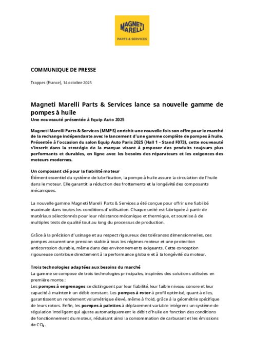 Magneti Marelli Parts and Services (MMPS) enrichit une nouvelle fois son offre pour le marché de la rechange indépendante avec le lancement d’une gamme complète de pompes à huile. Présentée à l’occasion du salon Equip Auto Paris 2025 (Hall 1 – Stand F073), cette nouveauté s’inscrit dans la stratégie de la marque visant à proposer des produits toujours plus performants et durables, en ligne avec les besoins des réparateurs et les exigences des moteurs modernes.