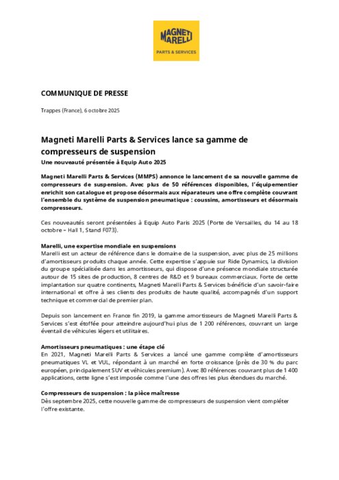 Magneti Marelli Parts et Services lance sa gamme de compresseurs de suspension