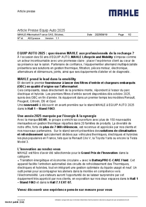 À l’occasion des 50 ans d’EQUIP AUTO, MAHLE Lifecycle and Mobility s’impose comme un acteur incontournable avec une promesse claire : placer l’expérience client au cœur de sa présence sur le salon. Partenaire de confiance, l’équipementier allemand multispécialiste présentera ses solutions en gestion thermique, filtration, pièces moteur, électronique, alternateurs et démarreurs, joints, ainsi que ses équipements d’atelier et de diagnostic.