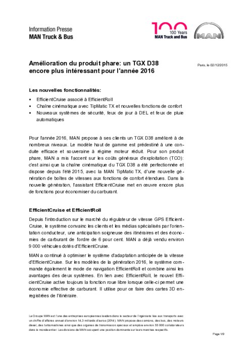 Pour l'année 2016, MAN propose à ses clients un TGX D38 amélioré à de nombreux niveaux. Le modèle haut de gamme est prédestiné à une conduite efficace et souveraine à régime moteur réduit. Pour son produit phare, MAN a mis l'accent sur les coûts généraux d'exploitation (TCO): c'est ainsi que la chaîne cinématique du TGX D38 a été perfectionnée et dispose depuis l'été 2015, avec la MAN TipMatic TX, d'une nouvelle génération de boîtes de vitesses aux fonctions de confort étendues.