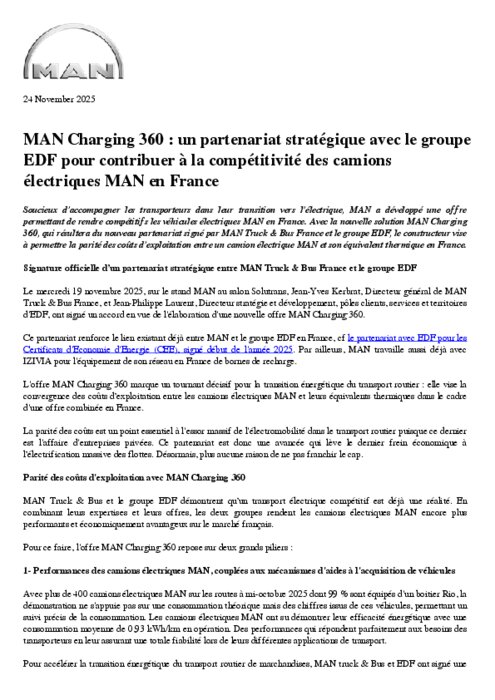 Soucieux d’accompagner les transporteurs dans leur transition vers l’électrique, MAN a développé une offre permettant de rendre compétitifs les véhicules électriques MAN en France. Avec la nouvelle solution MAN Charging 360, qui résultera du nouveau partenariat signé par MAN Truck & Bus France et le groupe EDF, le constructeur vise à permettre la parité des coûts d’exploitation entre un camion électrique MAN et son équivalent thermique en France.