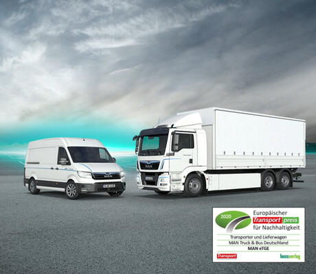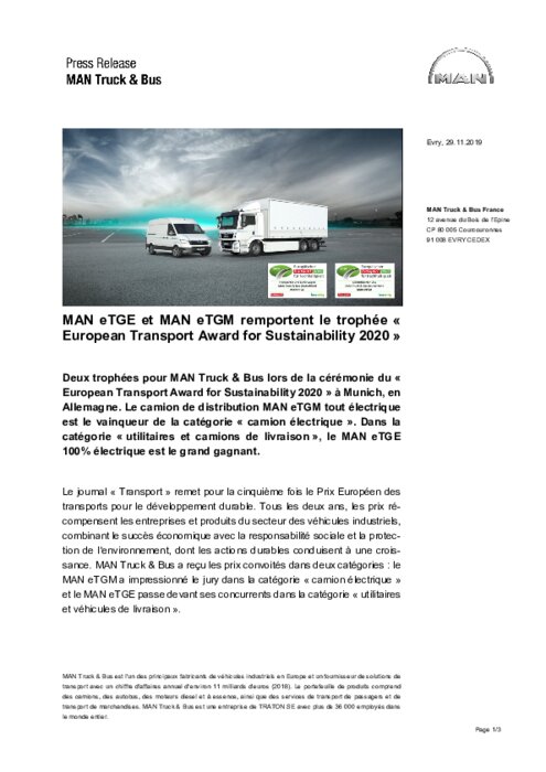 Deux trophées pour MAN Truck & Bus lors de la cérémonie du " European Transport Award for Sustainability 2020 " à Munich, en Allemagne. Le camion de distribution MAN eTGM tout électrique est le vainqueur de la catégorie " camion électrique ". Dans la catégorie " utilitaires et camions de livraison ", le MAN eTGE 100% électrique est le grand gagnant.