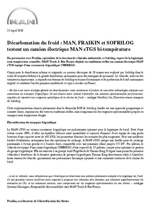 En partenariat avec Fraikin, spécialiste de la location de véhicules industriels, et Sofrilog, expert de la logistique sous température contrôlée, MAN Truck & Bus France déploie en conditions réelles un camion électrique MAN eTGS équipé d'une carrosserie frigorifique Chereau.