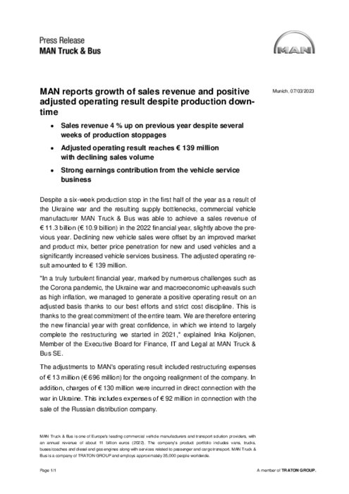 Malgré un arrêt de production de six semaines au premier semestre en raison de la guerre en Ukraine et des problèmes d'approvisionnement qui en ont résulté, le constructeur de véhicules industriels MAN Truck & Bus a pu réaliser un chiffre d'affaires de 11,3 milliards d'euros au cours de l'exercice 2022 (10,9 milliards d'euros en 2021), soit en légère hausse par rapport à l'année précédente.