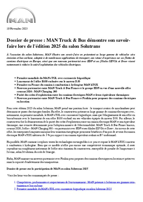 MAN au salon Solutrans 2025 où le constructeur a présenté en première mondiale le MAN eTGL carrosserie frigorifique et en première en France son camion à combustion à hydrogène MAN hTGX. Le constructeur a également profité du salon pour annoncer le lancement de l'offre B100 exclusive sur son moteur D30. Par ailleurs, Solutrans était aussi l'occasion pour MAN d'annoncer plusieurs partenariats : un avec EDF et ses filiales IZIVIA et Dreev visant notamment à réduire le coût d'exploitation des véhicules électriques, et un autre avec Fraikin pour proposer des camions électriques en location.