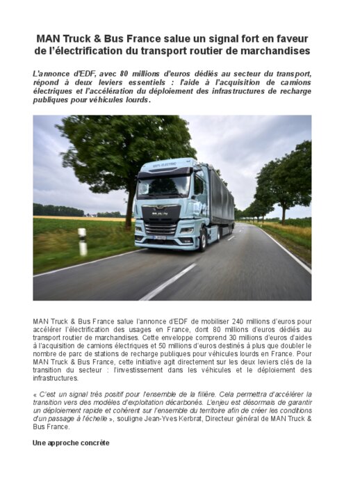MAN Truck & Bus France salue l’annonce d’EDF de mobiliser 240 millions d’euros pour accélérer l’électrification des usages en France, dont 80 millions d’euros dédiés au transport routier de marchandises. Cette enveloppe comprend 30 millions d’euros d’aides à l’acquisition de camions électriques et 50 millions d’euros destinés à plus que doubler le nombre de parc de stations de recharge publiques pour véhicules lourds en France. Pour MAN Truck & Bus France, cette initiative agit directement sur les deux leviers clés de la transition du secteur : l’investissement dans les véhicules et le déploiement des infrastructures.