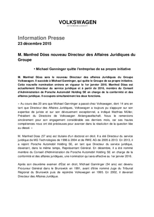M. Manfred Döss sera le nouveau Directeur des affaires Juridiques du Groupe Volkswagen. Il succède à Michael Ganninger, qui quitte le Groupe de sa propre initiative. Cette nouvelle nomination entrera en vigueur le 1er janvier 2016. Manfred Döss est actuellement Directeur du service juridique et à partir de 2016, membre du Conseil d'Administration de Porsche Automobil Holding SE en charge de la conformité et des affaires juridique. Il occupera simultanément les deux fonctions.