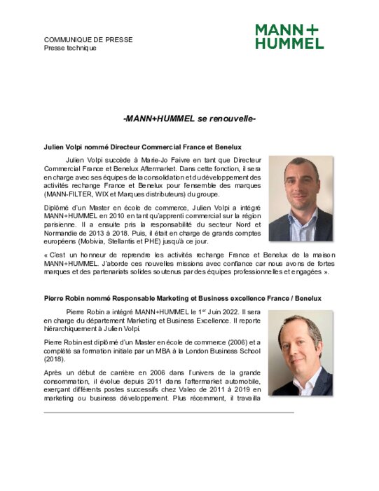 activités rechange France et Benelux pour l’ensemble des marques (MANN-FILTER, WIX et Marques distributeurs) du groupe. Pierre Robin est nommé Responsable Marketing et Business excellence France / Benelux. Il sera en charge du département Marketing et Business Excellence.