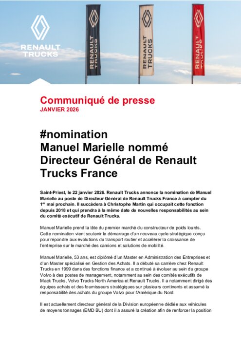 Renault Trucks annonce la nomination de Manuel Marielle au poste de Directeur Général de Renault Trucks France à compter du 1er mai prochain. Il succèdera à Christophe Martin qui occupait cette fonction depuis 2018 et qui prendra à la même date de nouvelles responsabilités au sein du comité exécutif de Renault Trucks.