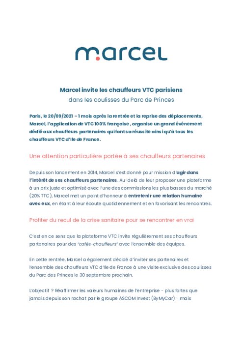 Services 21 septembre 2021 - 11:50 1 mois après la rentrée et la reprise des déplacements, Marcel, l’application de VTC 100% française , organise un grand événement dédié aux chauffeurs partenaires qui font sa réussite ainsi qu’à tous les chauffeurs VTC d’Ile de France. PDF (54 Ko) Télécharger