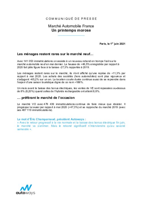 Les ménages restent rares sur le marché neuf. Avec 141 053 immatriculations, on assiste à un nouveau rebond en trompe l’œil sur le marché automobile neuf en mai dernier. La hausse de +46,5% enregistrée par rapport à 2020 fait pâle figure face à la baisse -27,3% rapportée à 2019. Le marché VO, avec 476 439 immatriculations, continue de faire mieux que résister. Il progresse lui aussi par rapport à mai 2020 (+47,3%) et se rapproche du marché 2019 (avec ses 487 119 immatriculations).