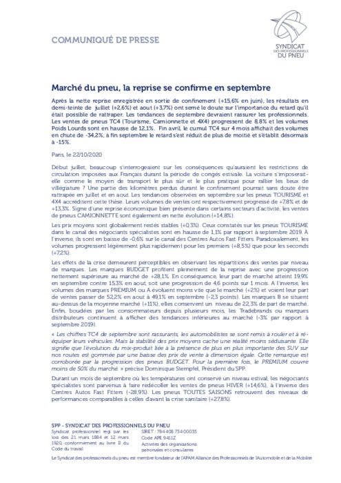 Marché du pneu: la reprise se confirme en septembre (SPP)