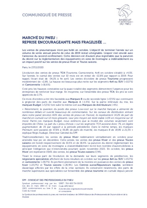 Les ventes de pneumatiques n'ont pas faibli en octobre. L'objectif de terminer l'année sur un volume de vente annuel proche de celui de 2019 restait atteignable. L'espoir s'est envolé avec l'annonce du second confinement. Cette décision est d'autant plus regrettable que la parution du décret sur la règlementation des équipements en zone de montagne a indéniablement eu un impact positif sur les ventes de pneus Hiver et Toutes saisons.