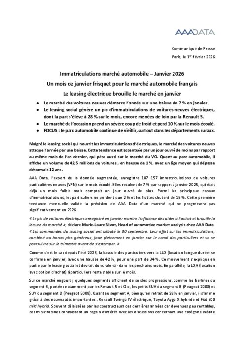 Malgré le leasing social qui nourrit les immatriculations d’électriques, le marché des voitures neuves attaque l’année par une baisse. Cette tendance est accentuée par un jour ouvré de moins par rapport au même mois de l’an dernier, qui pèse aussi sur le marché du VO. Quant au parc automobile, il affiche un volume de 42,5 millions de voitures , en hausse de 1 %, avec un âge moyen qui dépasse désormais 12 ans.