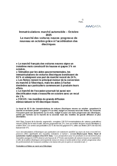 En octobre 2025, avec 139 513 immatriculations, le marché français des voitures particulières neuves est en hausse de 2,94% en données brutes par rapport à octobre 2024. Sur les dix premiers mois, le marché toujours en repli de 5,7% comparé à la même période de 2024.