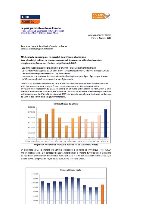 VO 04 janvier 2016 - 10:46 Avec plus de 5,5 millions de transactions au total, les ventes de véhicules d'occasion enregistrent en France des résultats inégalés de depuis 2007. . PDF (695 Ko) Télécharger