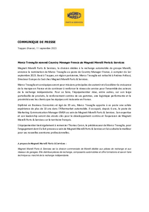 Equipementiers 11 septembre 2023 - 14:02 Marco Travaglia et son équipe auront pour missions principales de soutenir et d'accélérer la croissance de la marque en France et de continuer à renforcer le niveau de service pour l’ensemble des acteurs de la rechange indépendante. PDF (107 Ko) Télécharger