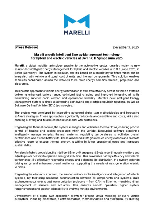 Marelli, fournisseur mondial de technologies de mobilité pour le secteur automobile, a dévoilé aujourd'hui sa nouvelle solution de gestion intelligente de l'énergie pour les véhicules hybrides et électriques lors du salon CTI Europe 2025, à Berlin (Allemagne). Le système est modulaire et repose sur un logiciel propriétaire qui peut être intégré aux unités de contrôle du véhicule et des zones ainsi qu'aux composants thermiques. Cette solution permet une coordination transparente entre les trois principaux domaines énergétiques du véhicule : thermique, propulsion et électronique.