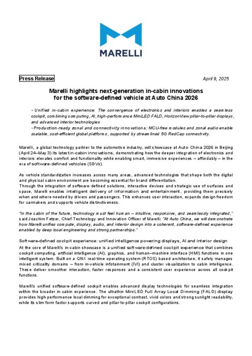 Marelli, partenaire technologique mondial de l'industrie automobile, présentera lors du salon Auto China 2026 à Pékin (du 24 avril au 3 mai) ses dernières innovations en matière d'habitacle, démontrant comment une intégration plus poussée de l'électronique et de l'intérieur améliore le confort et la fonctionnalité tout en offrant des expériences intelligentes et immersives – à un prix abordable – à l'ère des véhicules définis par logiciel (SDV).
