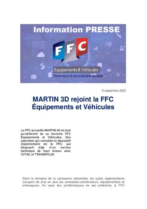 Equipementiers 06 septembre 2023 - 10:06 La FFC accueille MARTIN 3D en tant qu’adhérent de sa branche FFC Équipements et Véhicules. Une opération qui complète le dispositif réglementaire de la FFC, qui disposait déjà d’un service technique de haut niveau avec l’UTAC et TRANSPOLIS. PDF (287 Ko) Télécharger