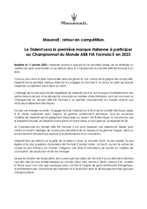 Maserati au Championnat du Monde ABB Formula E dès 2023