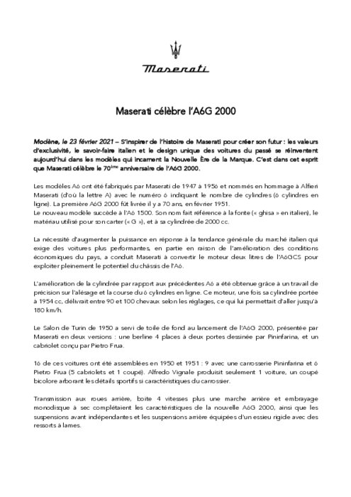 S’inspirer de l’histoire de Maserati pour créer son futur : les valeurs d’exclusivité, le savoir-faire italien et le design unique des voitures du passé se réinventent aujourd’hui dans les modèles qui incarnent la Nouvelle Ère de la Marque. C’est dans cet esprit que Maserati célèbre le 70ème anniversaire de l’A6G 2000.