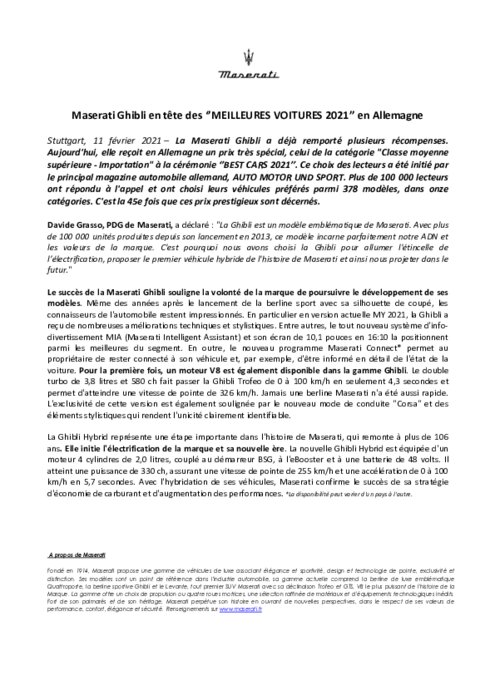 La Maserati Ghibli a déjà remporté plusieurs récompenses. Aujourd'hui, elle reçoit en Allemagne un prix très spécial, celui de la catégorie "Classe moyenne supérieure - Importation" à la cérémonie "BEST CARS 2021". Ce choix des lecteurs a été initié par le principal magazine automobile allemand, AUTO MOTOR UND SPORT. Plus de 100 000 lecteurs ont répondu à l'appel et ont choisi leurs véhicules préférés parmi 378 modèles, dans onze catégories...