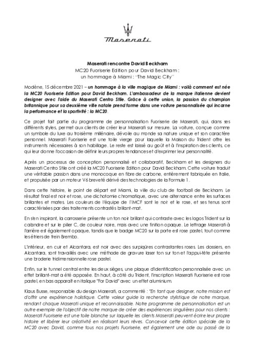 Un hommage à la ville magique de Miami : voilà comment est née la MC20 Fuoriserie Edition pour David Beckham. L'ambassadeur de la marque italienne devient designer avec l'aide du Maserati Centro Stile. Grâce à cette union, la passion du champion britannique pour sa deuxième ville natale prend forme dans une voiture personnalisée qui incarne la performance et la sportivité : la MC20.