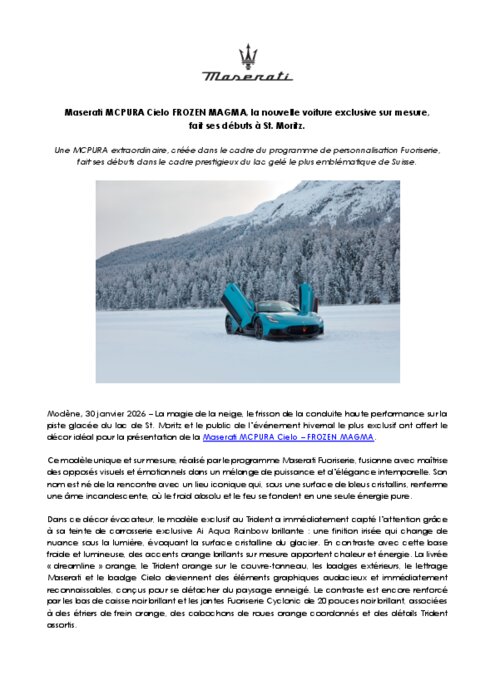 La magie de la neige, le frisson de la conduite haute performance sur la piste glacée du lac de St. Moritz et le public de l’événement hivernal le plus exclusif ont offert le décor idéal pour la présentation de la Maserati MCPURA Cielo – FROZEN MAGMA.