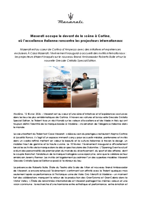 Maserati est au cœur de Cortina d’Ampezzo avec des initiatives et expériences exclusives. À Casa Maserati, l’événement inaugural a accueilli des invités internationaux : les projecteurs étaient braqués sur le nouveau Brand Ambassador Roberto Bolle et sur la nouvelle Grecale Cristallo Special Edition.