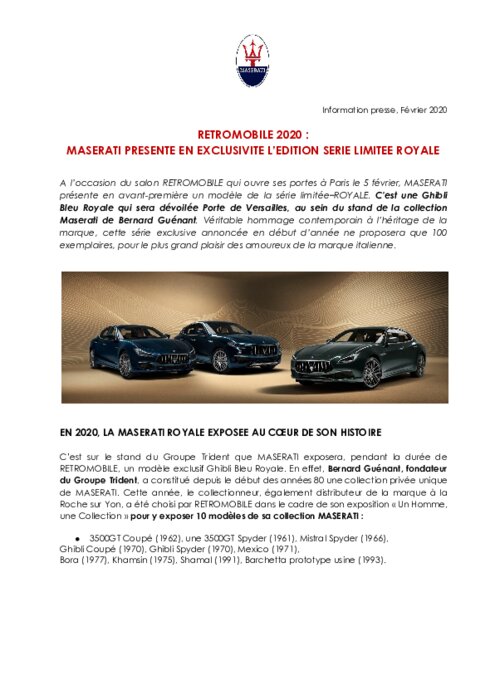 A l’occasion du salon RETROMOBILE qui ouvre ses portes à Paris le 5 février, MASERATI présente en avant-première un modèle de la série limitée -ROYALE. C’est une Ghibli Bleu Royale qui sera dévoilée Porte de Versailles, au sein du stand de la collection Maserati de Bernard Guénant. Véritable hommage contemporain à l’héritage de la marque, cette série exclusive annoncée en début d’année ne proposera que 100 exemplaires, pour le plus grand plaisir des amoureux de la marque italienne.