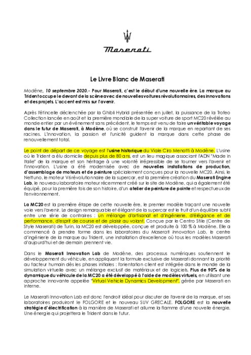 "Nous retournons sur la piste de course, là où tout a commencé pour nous. Avec la MC20, nous posons la pierre angulaire pour construire le futur de Maserati. C'est le début d'une nouvelle ère", a lancé Davide Grasso, le patron de Maserati, marque de l'italo-américain Fiat Chrysler (FCA).