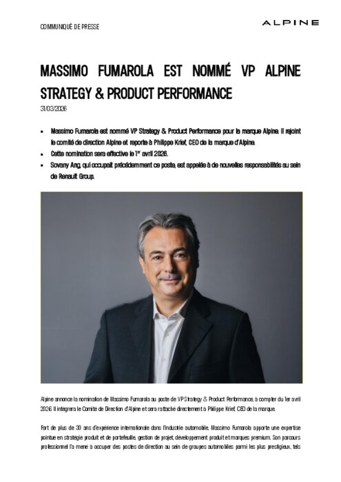 Constructeurs 31 mars 2026 - 15:38 Massimo Fumarola est nommé VP Strategy & Product Performance pour la marque Alpine. Il rejoint le comité de direction Alpine et reporte à Philippe Krief, CEO de la marque d'Alpine. PDF (178 Ko) Télécharger Crédit photo : Alpine