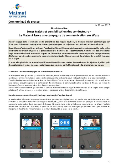 Acteur engagé dans le domaine de la prévention des risques routiers, le Groupe Matmut communique sur Waze pour diffuser des messages de bonnes pratiques pour un trajet sans encombre et en toute sécurité. Des millions d’automobilistes utilisent l’application Waze. Elle permet de connaître en temps réel le trafic et les conditions de circulation grâce à la participation des membres de la communauté.