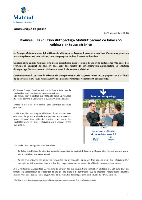 Le Groupe Matmut assure 2,7 millions de véhicules en France. Il lance une solution d’assurance pour ses assurés qui mettent leur voiture, leur camping-car ou leur 2 roues en location. L’automobile occupe toujours une place importante dans le mode de vie et le budget des ménages. Les Français se tournent de plus en plus vers des modes de consommation collaboratifs. La solution Autopartage Matmut permet de louer son véhicule en toute sérénité.