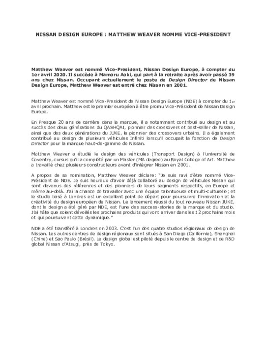 Matthew Weaver est nommé Vice-President, Nissan Design Europe, à compter du 1er avril 2020. Il succède à Mamoru Aoki, qui part à la retraite après avoir passé 39 ans chez Nissan. Occupant actuellement le poste de Design Director de Nissan Design Europe, Matthew Weaver est entré chez Nissan en 2001.