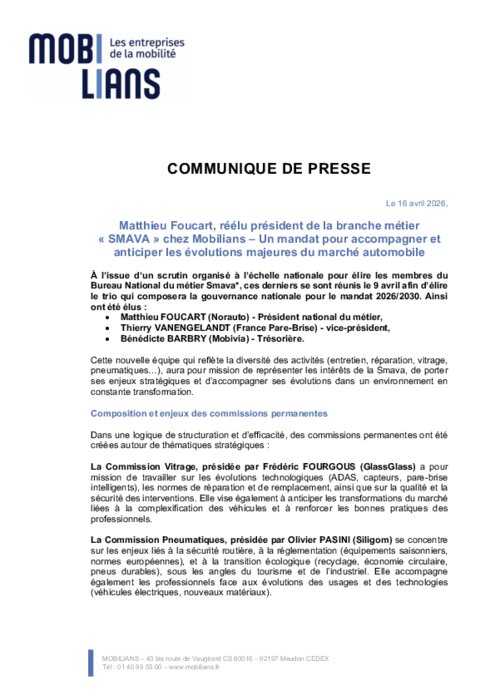 À l’issue d’un scrutin organisé à l’échelle nationale pour élire les membres du Bureau National du métier Smava (Services multimarques de l’après-vente automobile), ces derniers se sont réunis le 9 avril afin d’élire le trio qui composera la gouvernance nationale pour le mandat 2026/2030. Ainsi ont été élus : Matthieu FOUCART (Norauto) - Président national du métier, Thierry VANENGELANDT (France Pare-Brise) - vice-président et Bénédicte BARBRY (Mobivia) - Trésorière.