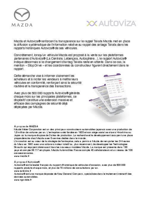Mazda met en place la diffusion systématique de l’information relative au rappel des airbags Takata dans les rapports historiques Autoviza de ses véhicules. Concrètement, lorsqu’un véhicule Mazda est proposé à la vente sur les plateformes partenaires d’Autoviza (La Centrale, Leboncoin, Autosphère…), le rapport Autoviza indique désormais si le changement d’airbag Takata reste en attente. Dans ce cas, la mention « Stop Drive » et les coordonnées du constructeur figurent directement dans le rapport.