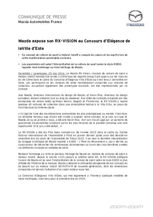 Le Mazda RX-Vision, concept de voiture de sport à moteur rotatif maintes fois primé, a attiré tous les regards lorsqu’il est apparu sur les rives du lac de Côme dans le cadre du Concorso d’Eleganza Villa d’Este qui s’est tenu à Cernobbio en Italie. Les participants et les visiteurs de cette manifestation consacrée aux voitures de collection, accueillant également des prototypes exclusifs, ont été impressionnés par ce concept.