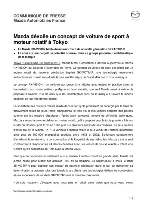 Mazda Motor Corporation a dévoilé aujourd'hui le Mazda RX-VISION au Salon de l'Automobile de Tokyo. Ce concept de voiture de sport est animé par un moteur rotatif de nouvelle génération baptisé SKYACTIV-R, une technologie résolument anticonformiste qui est sans doute la plus emblématique de l'esprit d’innovation de la marque.