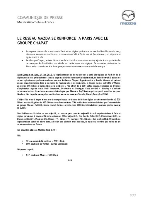 La représentation de la marque à Paris et en région parisienne se matérialise désormais par 3 sites aux nouveaux standards : 2 concessions VN à Paris 11e et Courbevoie ; un réparateur agréé dans le 16e. Le Groupe Chapat, acteur historique de la distribution auto et moto, ajoute à son portefeuille de marques la distribution de Mazda sur cette zone stratégique. Ce nouveau partenaire de Mazda doit contribuer à la forte progression des volumes de vente de la marque.
