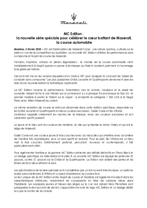 Constructeurs 02 février 2022 - 10:01 MC est l'abréviation de Maserati Corse : une nature sportive, cultivée sur la piste en vue de la compétition au quotidien. La nouvelle MC Edition célèbre les performances sans compromis et l'esprit de course de Maserati. PDF (124 Ko) Télécharger