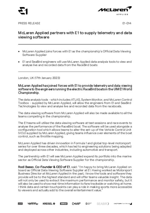 McLaren Applied s'est associé à E1 pour fournir un logiciel de télémétrie et de visualisation des données aux ingénieurs qui pilotent les bateaux électriques RaceBird dans le championnat du monde UIM E1.