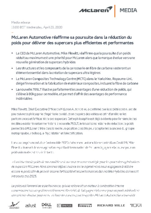 Mike Flewitt, Chief Executive Officer de McLaren Automotive, a confirmé que la société continuera de poursuivre sa philosophie d'ingénierie de réduction de poids des véhicules afin d'améliorer les performances et l'efficacité de ses supercars. Cette philosophie est déjà évidente pour l’ensemble des modèles existants notamment dans la nouvelle 765LT, le travail sans relâche de réduction de poids permettra à McLaren d’être dans la meilleure position possible...