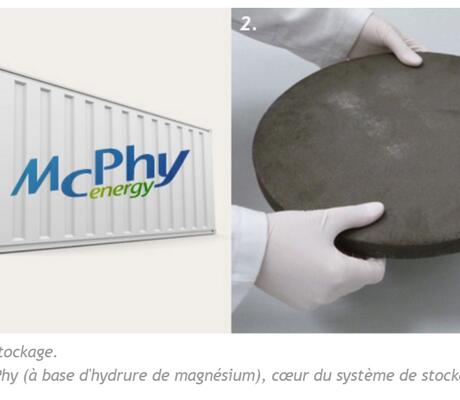 Partant de ce constat, McPhy a engagé une décennie de recherches, en partenariat avec le CNRS et le Commissariat à l'énergie atomique et aux énergies alternatives, avec l'idée de convertir en hydrogène ces surplus d'électricité "verte" par électrolyse de l'eau: le courant permet de la décomposer en oxygène, qui est rejeté dans l'air, et en (di)hydrogène, qui, associé à un métal par hydruration, est capté sous la forme de galette.