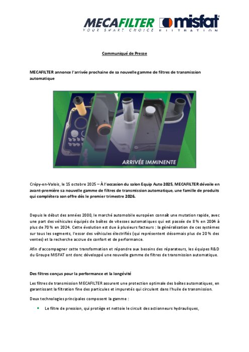 Equipementiers 15 octobre 2025 - 10:13 À l’occasion du salon Equip Auto 2025, Mecafilter dévoile en avant-première sur son stand (Hall 1 - H074) sa nouvelle gamme de filtres de transmission automatique, une famille de produits qui complétera son offre dès le premier trimestre 2026. PDF (246 Ko) Télécharger credit Mecafilter
